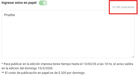 Tener en cuenta que el aviso papel que se ingresa desde atuogestión tiene un límite de 140 caracteres y a su vez tiene un valor adicional al precio del aviso web que es de $320 por cada domingo.