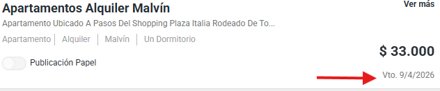 Dentro de tu cuenta verás tu aviso en la pestaña de avisos "Activos", abajo a la derecha del mismo verás el vencimiento web: